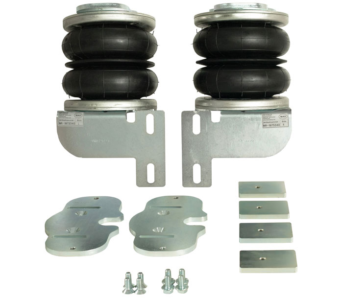 Our Air helper spring kits, which are also known as ‘semi-air conversions’, ‘air assisters’ and ‘air bags’, come in two basic types – ‘RED’ which sits inside the OE coil spring and then there’s ‘BLACK’ which sits between the axle and chassis rail. Red air bags are typically fitted on coil springs in cars, vans and pickups and can come with an on-board compressor mounted in the boot area, which you can use your own or make use of one at a fuel station. Whereas Black air bags are fitted to leaf springs in vans and pickups and can be supplied as either: a Air Master Basic (bags, airlines & Schrader valve), a Air Mast Comfort (which also includes a compressor & pressure gauges), or a Air Master Automatic (which also has self-levelling).